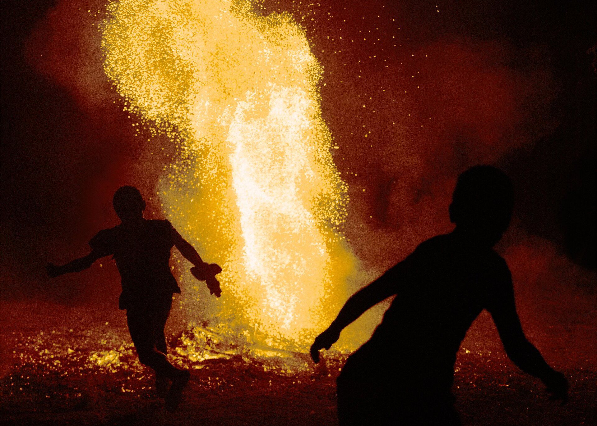 D’abord, il y a le feu. Non comme une explosion, non comme un spectacle, mais comme une présence qui s’attarde. Une colonne de particules incandescentes s’élève du sol, illuminant la nuit comme une plaie qui refuse de se refermer. Deux silhouettes courent, leurs corps pris entre la peur et la familiarité.